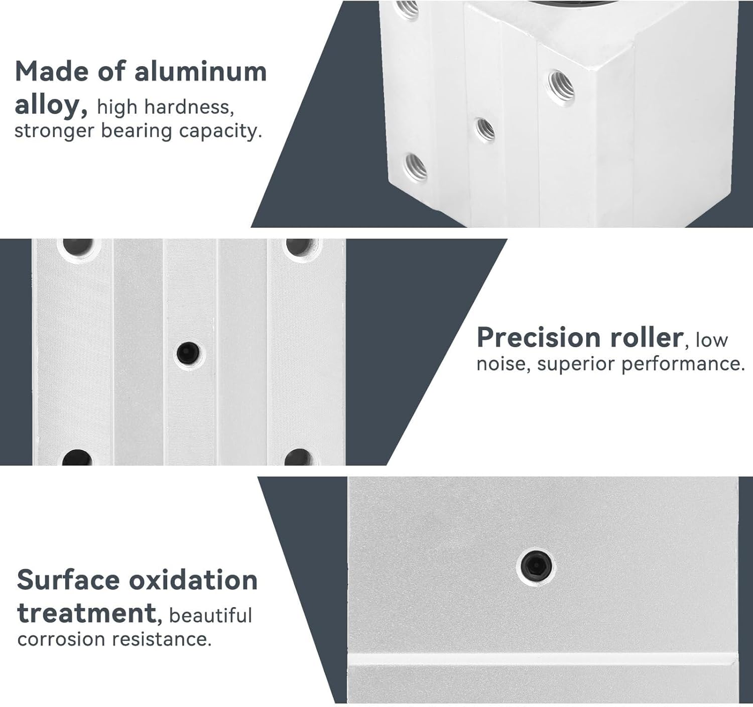 Specification:Material: Aluminum alloyWeight: 598g/21.1ozModel: SBR30UU Height: 56mmInner diameter: 30mmPurpose: transmission deviceLubricant: oil lubricationLubrication method: drip lubricationPackage List:1 x Open Linear Bearing Slides