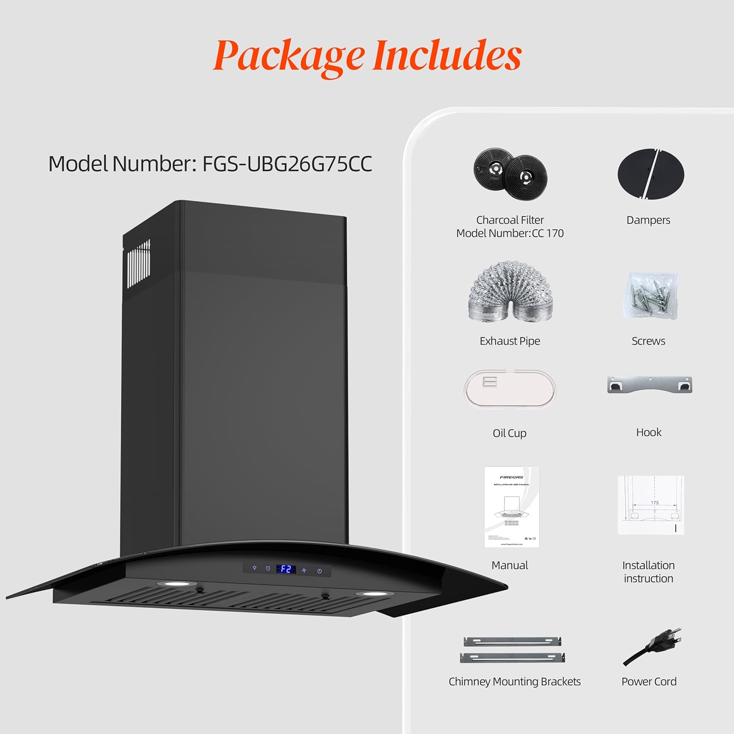 | Included Components | 30 inch Black Range Hood, CC170 Charcoal Filters, 2 Baffle Filters, Damper, Duct Pipe, Oil Cup, Plug, Manual, Installation Drawing, Screw, Hook, Bracket |