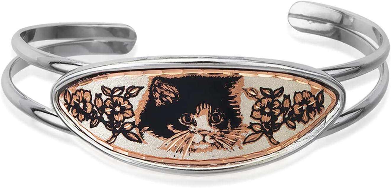 Cooper silver bangle bracelets are copper arts that have a screen printed on a silver-plated copper sheet (Copper Medallions, Bangle) Pieces are individually diamond cut to reveal the rosy luster of the copper. Three layers of acrylic finishes on the jewelry (does not tarnish) no polishing required. Every handmade craft has 25 steps and requires about a week for completion