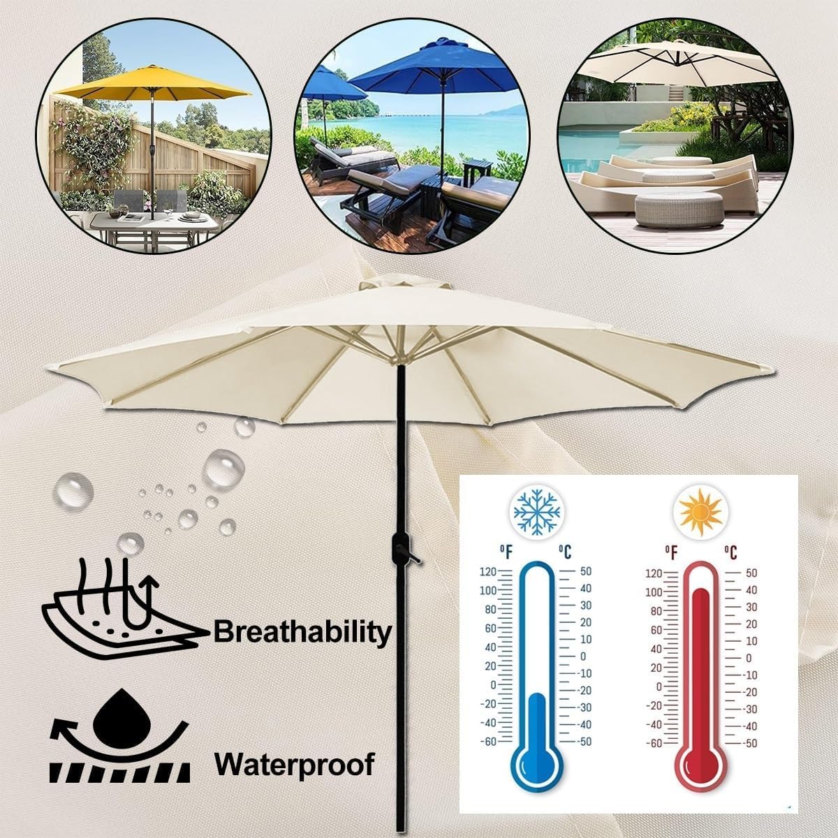 ✿ Specifications:● Material: 180g Polyester Fabric● Diameter: 2M/6.5FT, 2.7M/8.8FT, 3M/9.8Ft● Ribs: 6/8 Ribs✿ Package Included:1 x Umbrella Fabric Canopy Cover✿ FadeSafe FabricWaterproof, UV-resistant, and colorfast dyed fabric. Our Umbrella Replacement Cloth makes your patio umbrella last longer and stay strong for years.✿ Measurement methods- 6.5ft/2m parasol/umbrella - Each rib must measure 38 to 39 inch (97 - 99 cm).- 8.8ft/2.7m parasol/umbrella - Each rib must measure 52 to 54 inch (132 - 134 cm).- 9.8ft/3m parasol/umbrella - Each rib must measure 57 to 59 inch (145 - 147 cm).